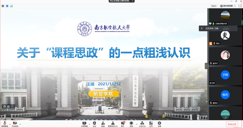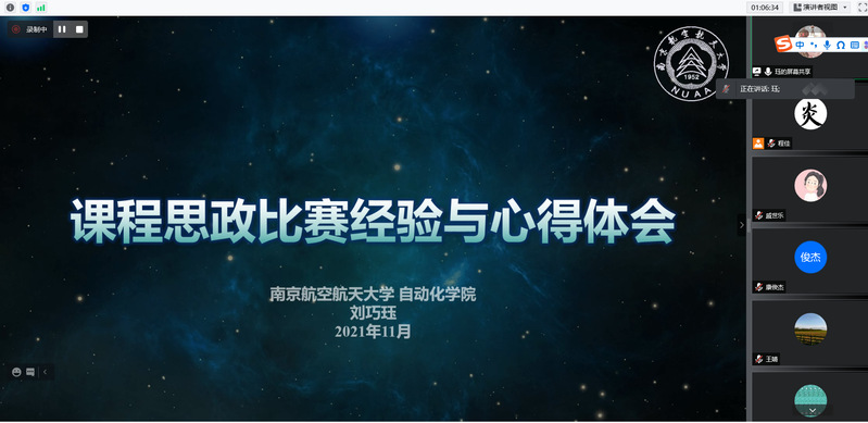 11月12日晚,betway西汉姆联官网线上开展了课程思政教学比赛经验分享会,本次活动邀请航空学院王婧教授、自动化学院刘巧珏老师作为主讲嘉宾,她们曾分别获得2020年校“课程思政”教学比赛特等奖和一等奖。各学院教师参加了此次分享会。