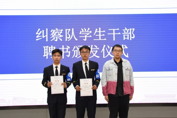 宋歌为纠察队学生干部颁发聘任证书。