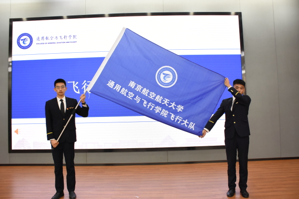 随后,上届飞行大队大队长张博昱同学与新一届飞行大队大队长山长磊同学进行了飞行大队队旗交接仪式。