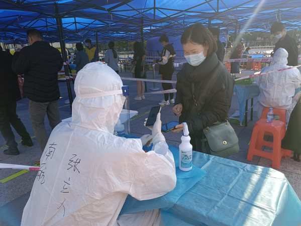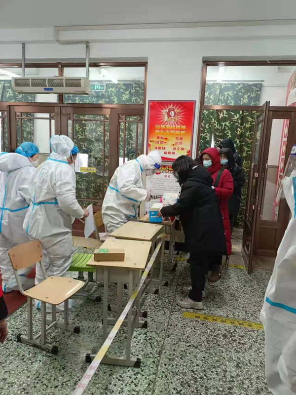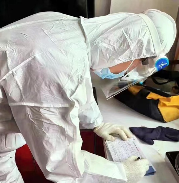 核酸检测工作从早上8点开始不间断至晚上,志愿者和医护人员们便要提前一个小时到场布置场地,张立人同学也积极参与其中,他帮助工作人员搬桌子,布置太阳伞,拉警戒线,几乎所有零碎的工作都做过。检测工作开始后,他便穿上防护服,拿起手机给群众录用信息,由于人员的匮乏,穿上防护服后,他要一连工作四个小时,期间不能上厕所,不能吃东西。虽然条件艰苦,但他仍旧没有任何怨言。