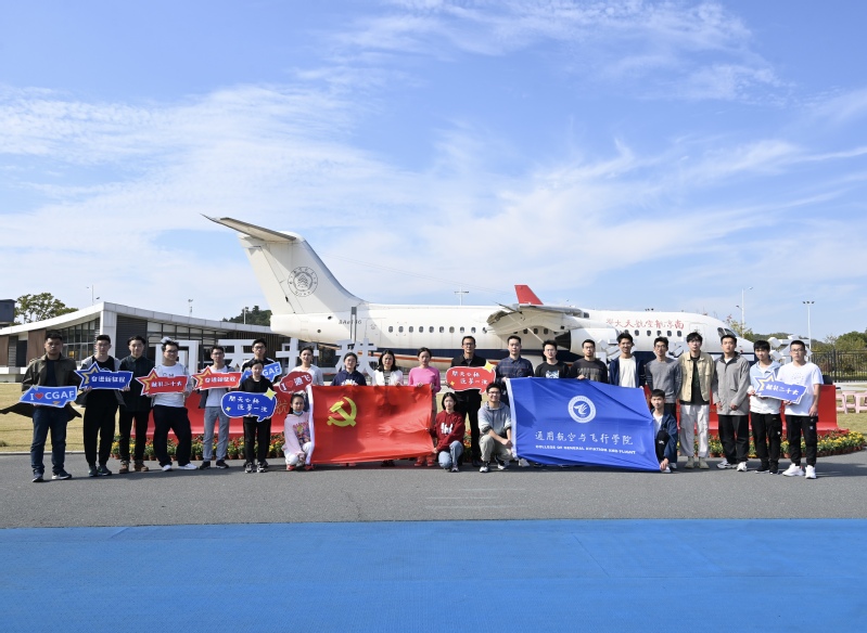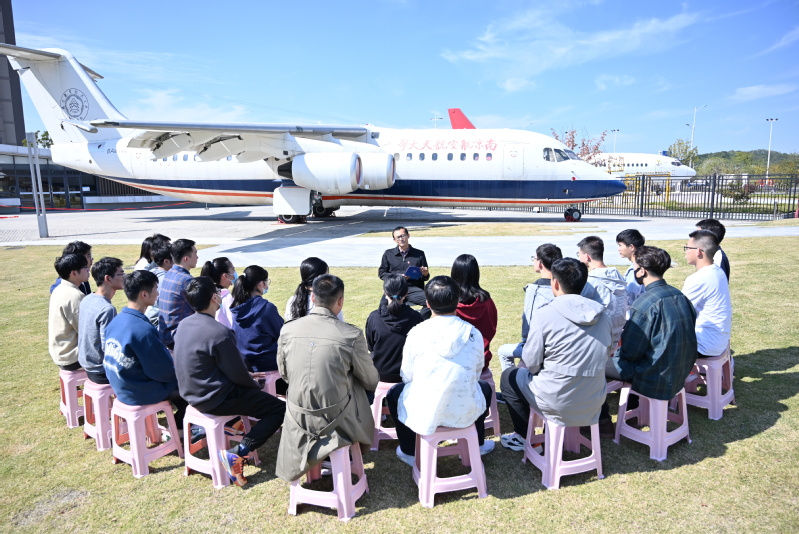 飞机旁,通飞学子围坐在一起,聆听学院党委副书记魏慧冬带来的爱校荣校思政课。