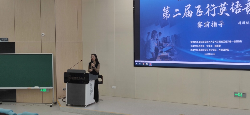 飞行英语竞赛介绍由黄幼老师主讲,黄幼老师围绕飞行英语竞赛内容、赛制及细则做了详细解读,向大家介绍了各赛程的试题类型与考核方式。本次比赛以初赛、复赛、决赛的顺序进行,难度和考核面逐步深入,对参赛选手的专业知识与反应能力进行全方面地考察。随后,黄老师按照飞行技术专业人才培养方案和国际民航组织(ICAO)对飞行学生英语水平的要求,以《中国民航飞行员英语水平考试900句》为基础,对同学们开展赛前指导,特别加强复诵、飞行英语基础知识和英语无线电陆空通话能力等方面的训练。