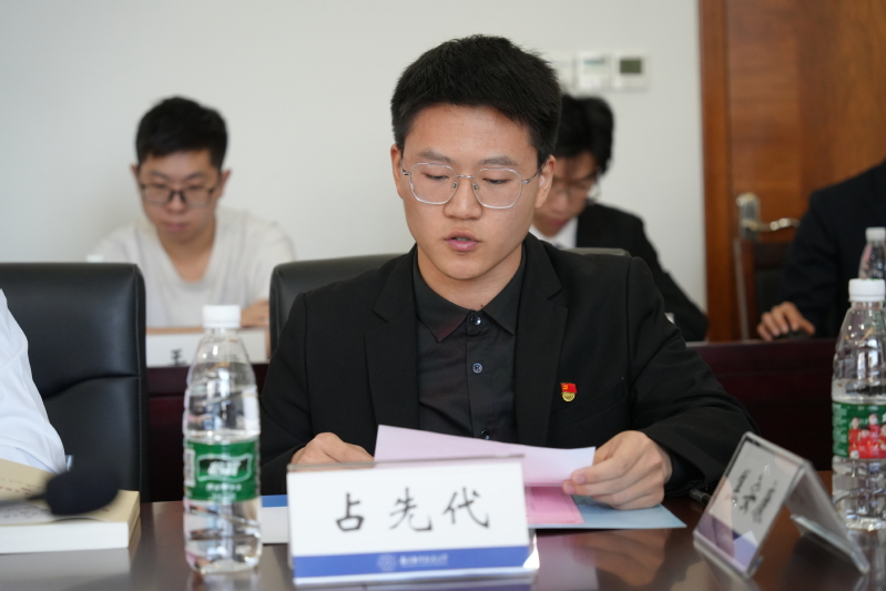 来自三个学院的学生代表章文龙、占先代、苌灿之结合自身学习成长经历,分别围绕支部理论学习、学生工作开展、个人素质提升、涵养爱国情怀等分享了自身心得体会,认为青年学生应当加强理论学习,树立终身学习意识,坚定不移听党话、跟党走,努力成长为德智体美劳全面发展的社会主义建设者和接班人。