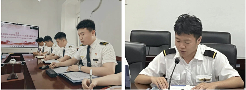 中国民航大学飞行分校20134110班副班长刘成鹤、betway西汉姆联官网2021107班班长张虎分别领学《习近平新时代中国特色社会主义思想专题摘编》与《习近平关于调查研究论述摘编》有关内容。全体参学人员共同读原著、学原文、悟原理,多思多想、学深悟透,努力把习近平新时代中国特色社会主义思想转化为坚定理想、锤炼党性和指导实践的强大力量。