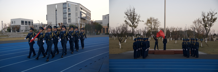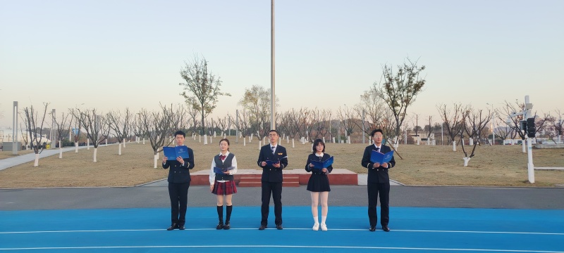 时维季冬之初,序数十二之始。迎着初冬的朝阳,国旗护卫队迈着铿锵有力的步伐护送五星红旗走向升旗台。在雄壮嘹亮的国歌声中,五星红旗冉冉升起,迎风飘扬。全场师生面向国旗行注目礼,浓烈的爱国情怀在每一位师生心中澎湃、激荡。