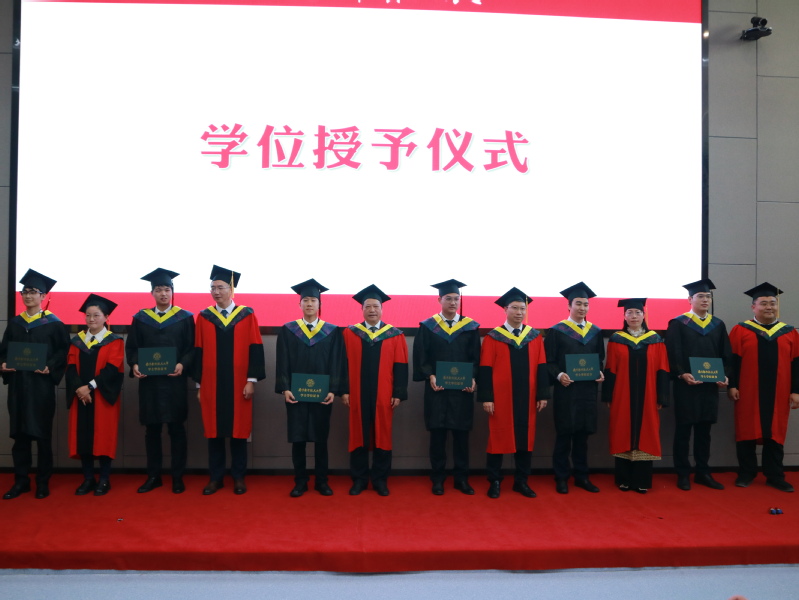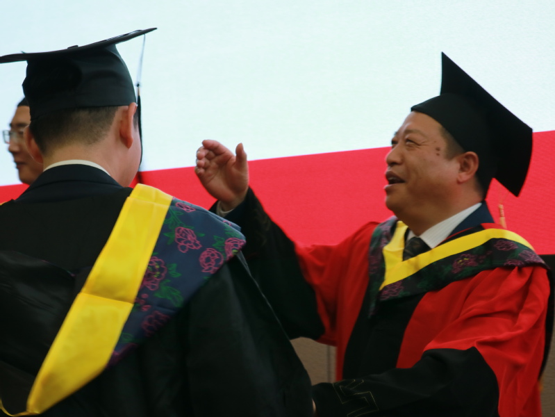 在学位授予仪式环节,王勤、张洪海、高振兴、李桂芳、于健、徐小玉为毕业生拨苏正冠、颁发学位证书并合影留念。
