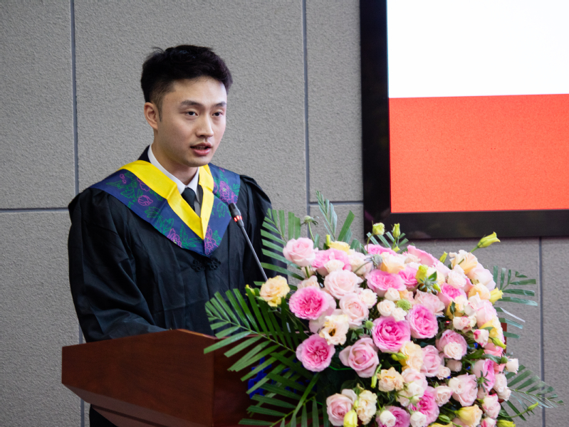 李衍熹作为学院优秀毕业生代表发言,他代表全体毕业生,向学校、院系、家人、同窗挚友致以最诚挚的感谢。他回顾了在求学生涯中经历一次次的挑战而不断成长的故事,展望未来将努力练就过硬本领,为谱写交通强国民航新篇章贡献自己的青春力量。