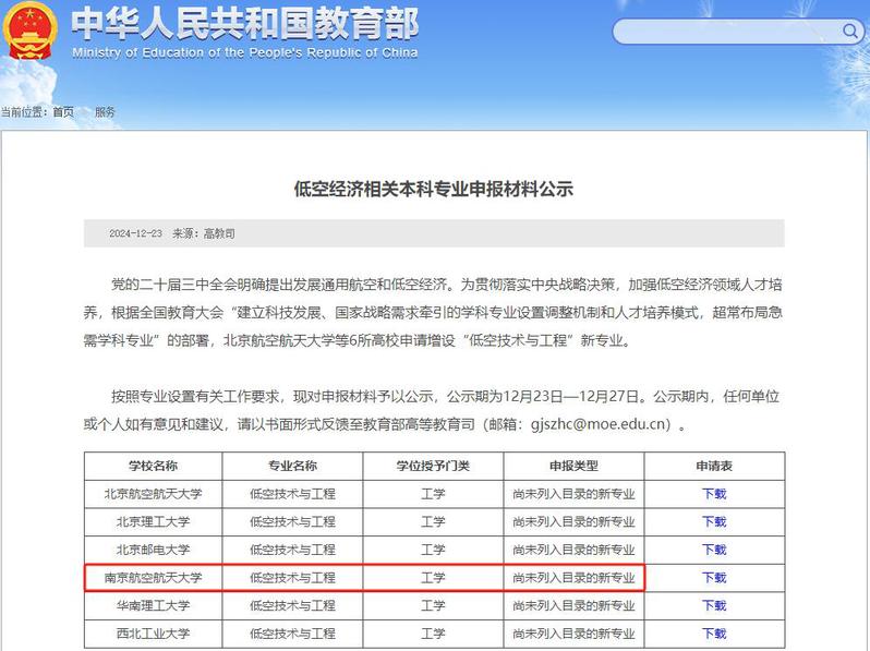 党的二十届三中全会明确提出发展通用航空和低空经济。为贯彻落实中央战略决策,加强低空经济领域人才培养,根据全国教育大会“建立科技发展、国家战略需求牵引的学科专业设置调整机制和人才培养模式,超常布局急需学科专业”的部署,2024年下半年,教育部增设“低空技术与工程”新专业。