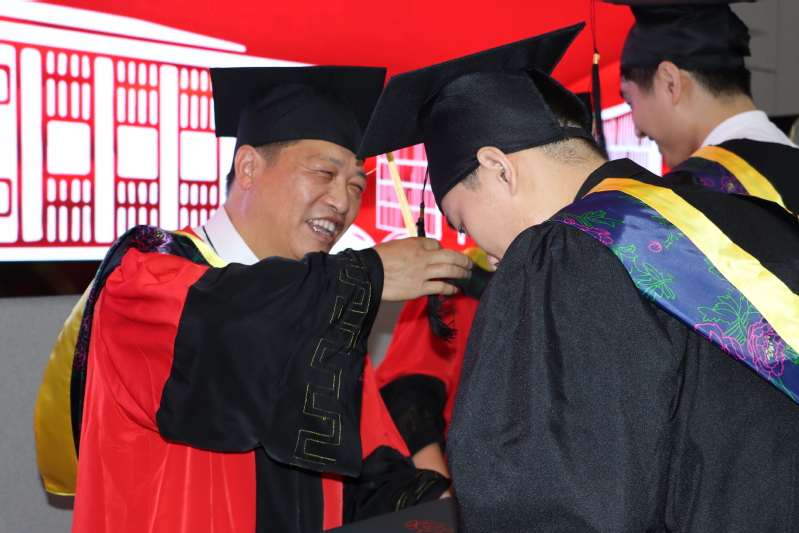 在学位授予仪式环节,王勤、司海青、贾旭、于健、方光武、黄幼为毕业生拨正流苏、颁发学位证书。
