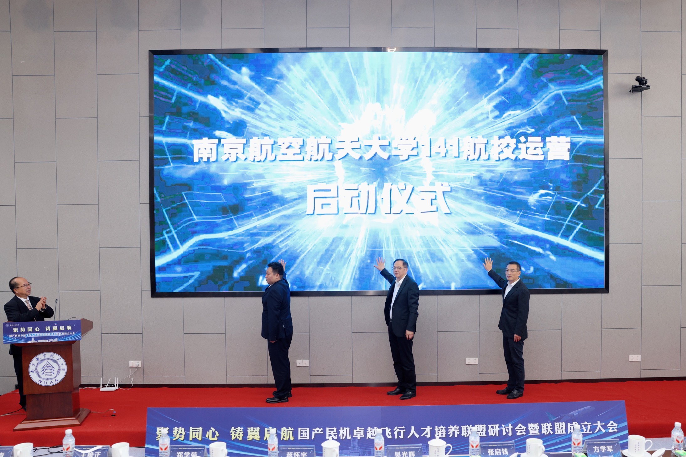 张启钱、方学军以及吉林福航航空学院董事长李雷共同启动南京航空航天大学CCAR-141航校运营仪式。本次仪式标志着由南京航空航天大学主导,与溧阳市人民政府、吉林省福航航空学院三方联合组建的全新航校正式开启其专业化、规范化的飞行培训征程,对学校实现民航飞行人才全链条自主培养、为国产民机事业输送具备全球视野与卓越技术能力的高素质飞行人才、增强巩固与溧阳市校地合作具有重要意义,为学校民航特色高质量发展提供有力支撑。