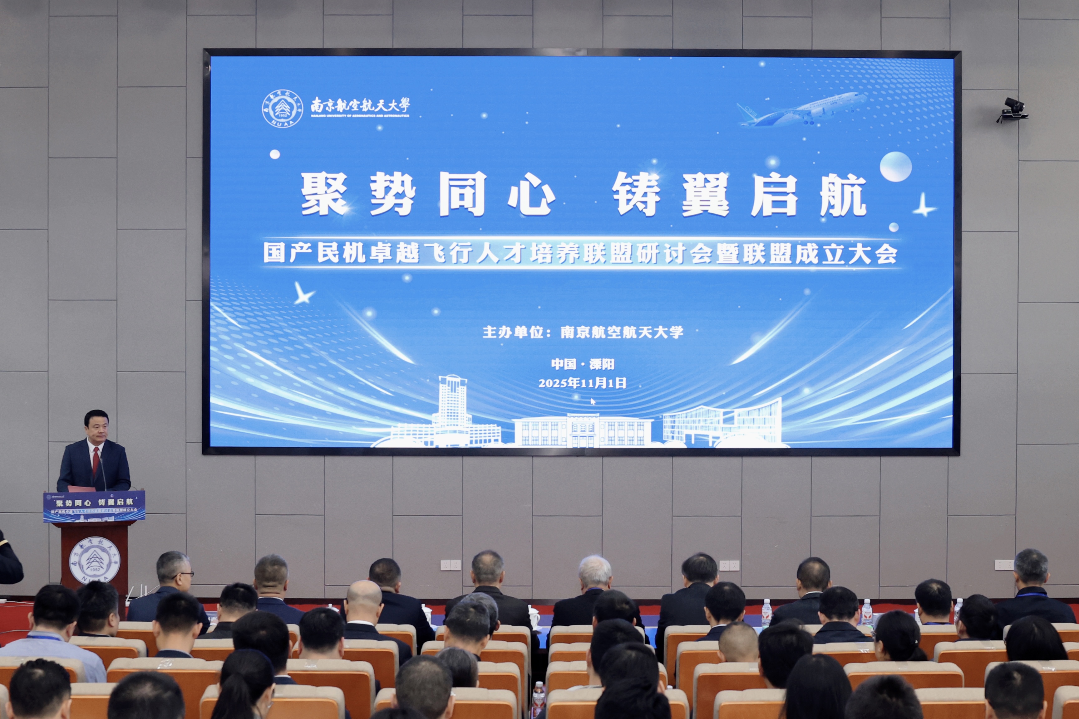 11月1日,国产民机卓越飞行人才培养联盟研讨会暨联盟成立大会在我校举行。中国工程院院士、中国商用飞机有限责任公司首席科学家、国产大飞机C919总师吴光辉,中国民用航空江苏安全监督管理局局长、党委书记郑学荣,溧阳市副市长方学军,中国民用航空飞行学院党委副书记王维正,中国国际航空股份有限公司副总飞行师兼飞行技术管理部总经理刘春江,中国东方航空股份有限公司飞行技术管理部副总经理周晓青,中国南方航空股份有限公司飞行总队总队长助理、飞行训练管理部副总经理张云涛,中国航空技术国际控股有限公司航空运营支持事业部副总经理蒋金,春秋航空股份有限公司副总裁沈巍,成都航空有限公司总飞行师王芃,深圳航空有限责任公司人力资源部总经理曾小锋,厦门航空有限公司飞行技术管理部党委书记罗艳,山东航空股份有限公司飞行技术管理部总经理王一潭,上海吉祥航空股份有限公司飞行标准管理部副总经理毛鑫,中国民航大学飞行分校副校长陈斌,我校党委常委、副校长张启钱等出席大会。大会由我校betway西汉姆联官网党委书记高健主持。