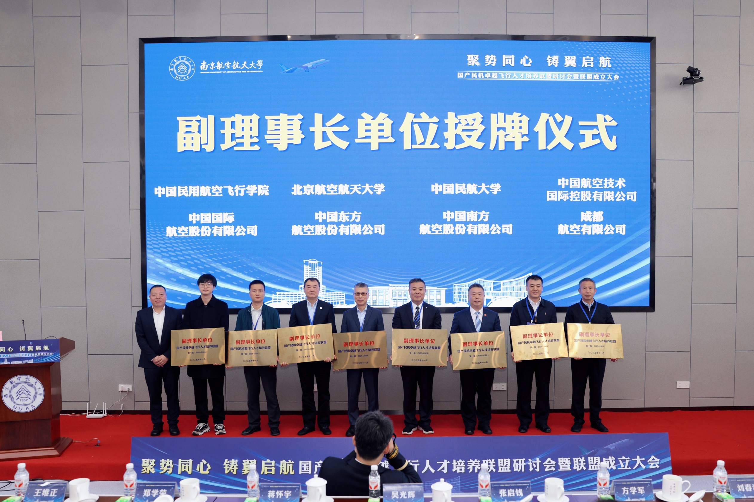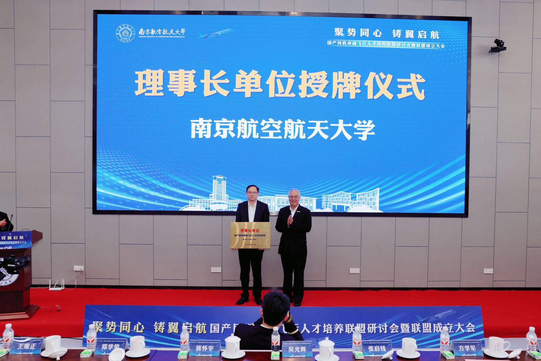大会选举产生由南京航空航天大学任理事长单位,中国民用航空飞行学院、北京航空航天大学、中国民航大学、中国航空技术国际控股有限公司、中国国际航空股份有限公司、中国东方航空股份有限公司、成都航空有限公司等任副理事长单位,黄领才任秘书长的首届领导机构。吴光辉、郑学荣分别为理事长和副理事长单位授牌。